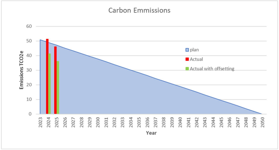 We project that carbon emissions will decrease over the five years from baseline to 41.45 tCO2e by 2028. This is a reduction of 18.5%, with a projected yearly reduction of 3.7%. We will utilise any future opportunities on our carbon reduction journey wherever possible to achieve Net Zero ahead of schedule.