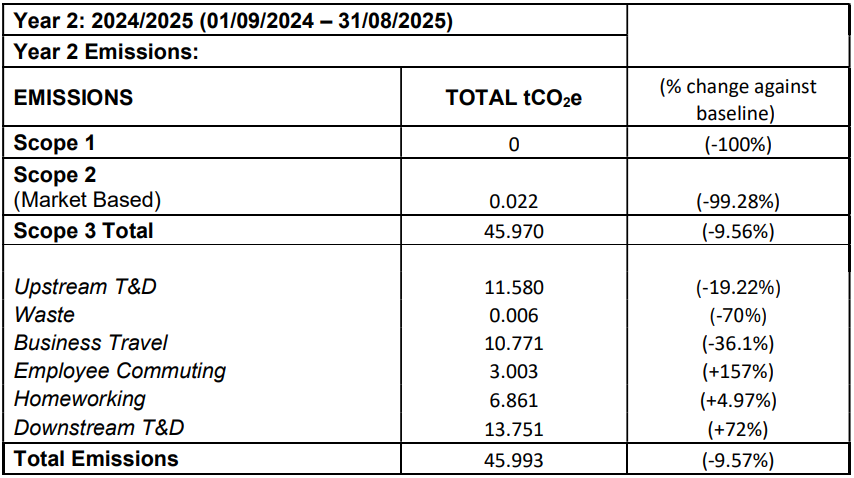 In year 2 Scope 1 emissions have been eliminated and Scope 2 reduced by 99.28% in comparison to the baseline. Despite changes in demand for services that require more product transport and an expansion in sales territory, Scope 3 emissions have decreased. Overall emissions have decreased by 9.57% from baseline (50.864 to 45.993 tCO2e).